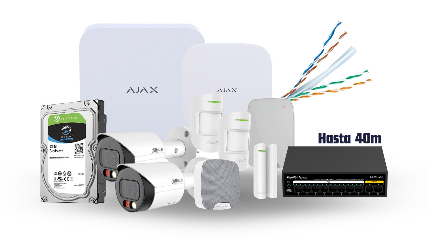 Kit completo de videovigilancia + alarma profesional Grado 2, incluye 2 cámaras IP 4MP, NVR 8 canales, disco duro 2TB, switches PoE, 40 m cable Cat6, central de alarma inalámbrica, sirena interior, teclado, 2 detectores PIR y contacto magnético.