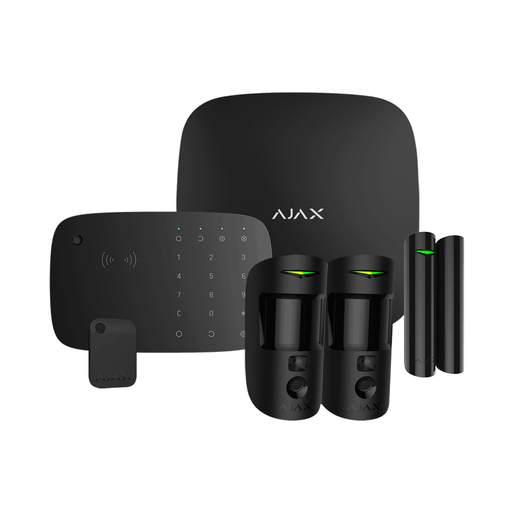 Kit de alarma profesional Ajax con HUB 2, 2 detectores PIRCAM, contacto magnético, teclado con lector RFID, sirena interior y 1 llavero TAG. Comunicación Ethernet y dual SIM GPRS. Certificación Grado 2.