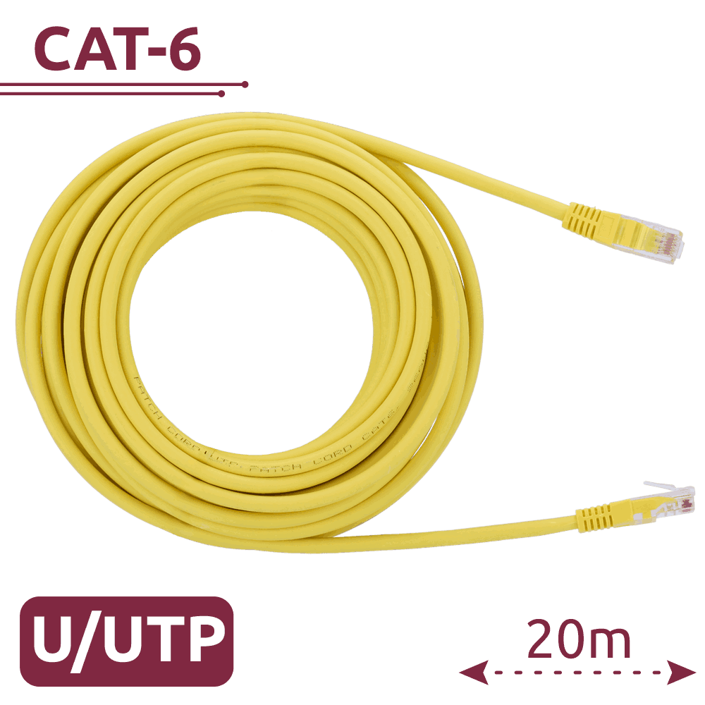 Cable UTP Ethernet Categoría 6 de 20 metros en color amarillo, con conectores RJ45 resistentes. Ideal para asegurar velocidad y estabilidad en redes domésticas y profesionales.