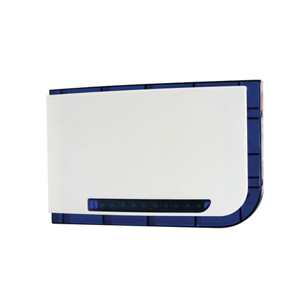 Sirena de exterior blanca con flash azul, doble piezo de 115 dB, 2 tonos, LEDs configurables y batería incluida. Carcasa de policarbonato con protección UV. Grado 3, alimentación 12V CC.